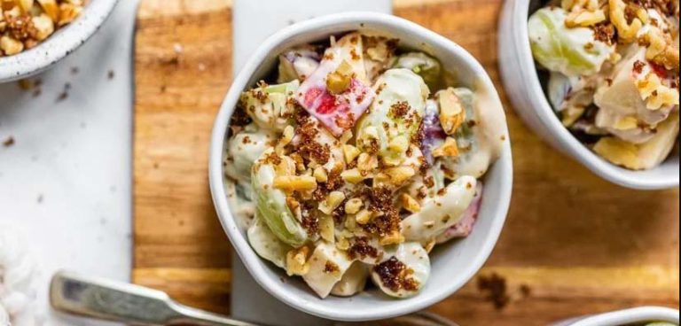 This fall fruit salad is made with sweet, crunchy apples and grapes in a creamy yogurt and cream cheese sauce topped with crushed walnuts and brown sugar.
