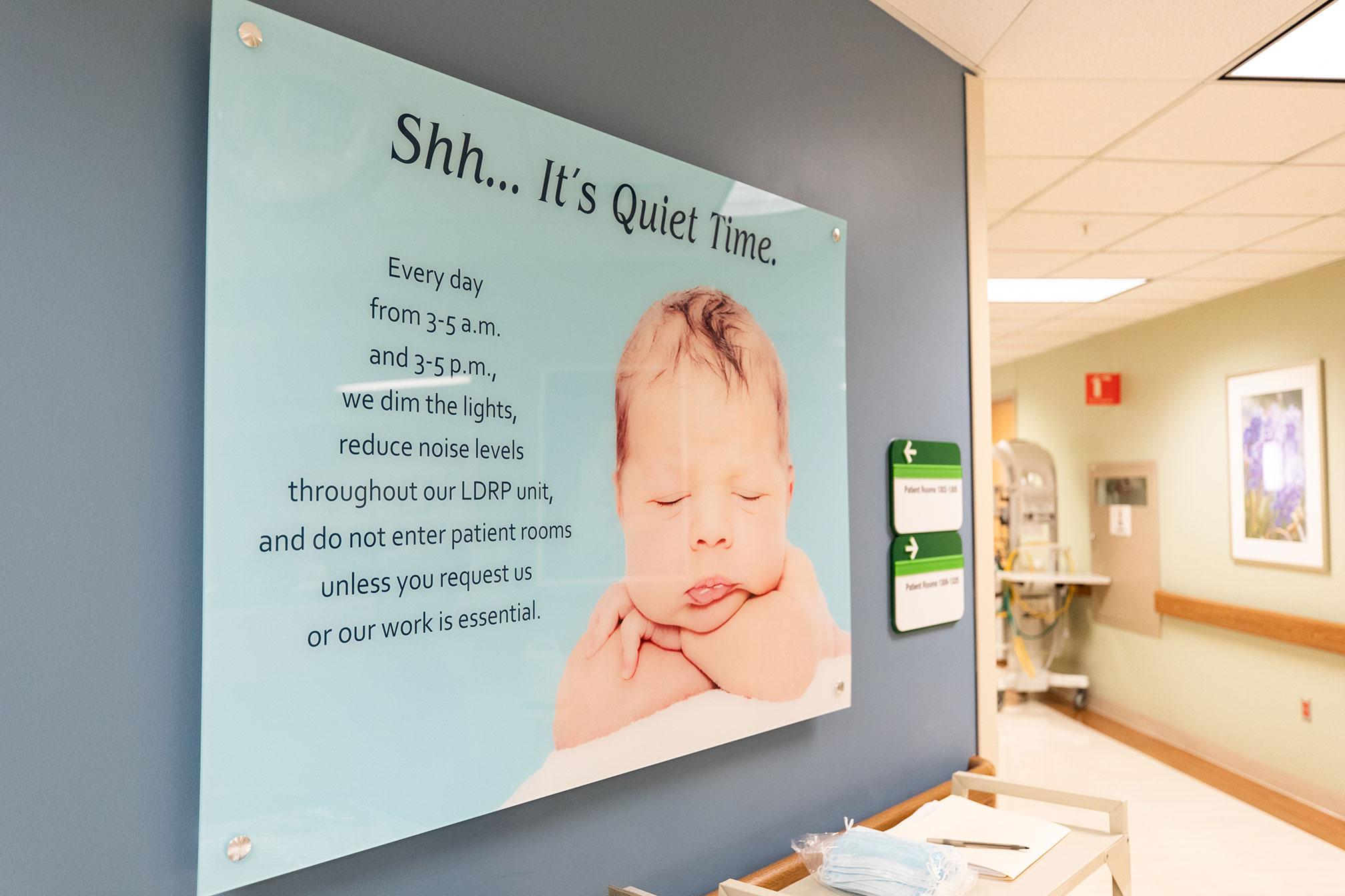 Each day from 3:00 a.m. to 5:00 a.m. and 3:00 p.m. to 5:00 p.m. lights will be dimmed and the noise level will lower in the halls and at the nurses’ stations. Nurses and other staff will refrain from entering patient rooms unless they are requested by the patient, they need to perform an essential task, or the patient has an urgent care need.