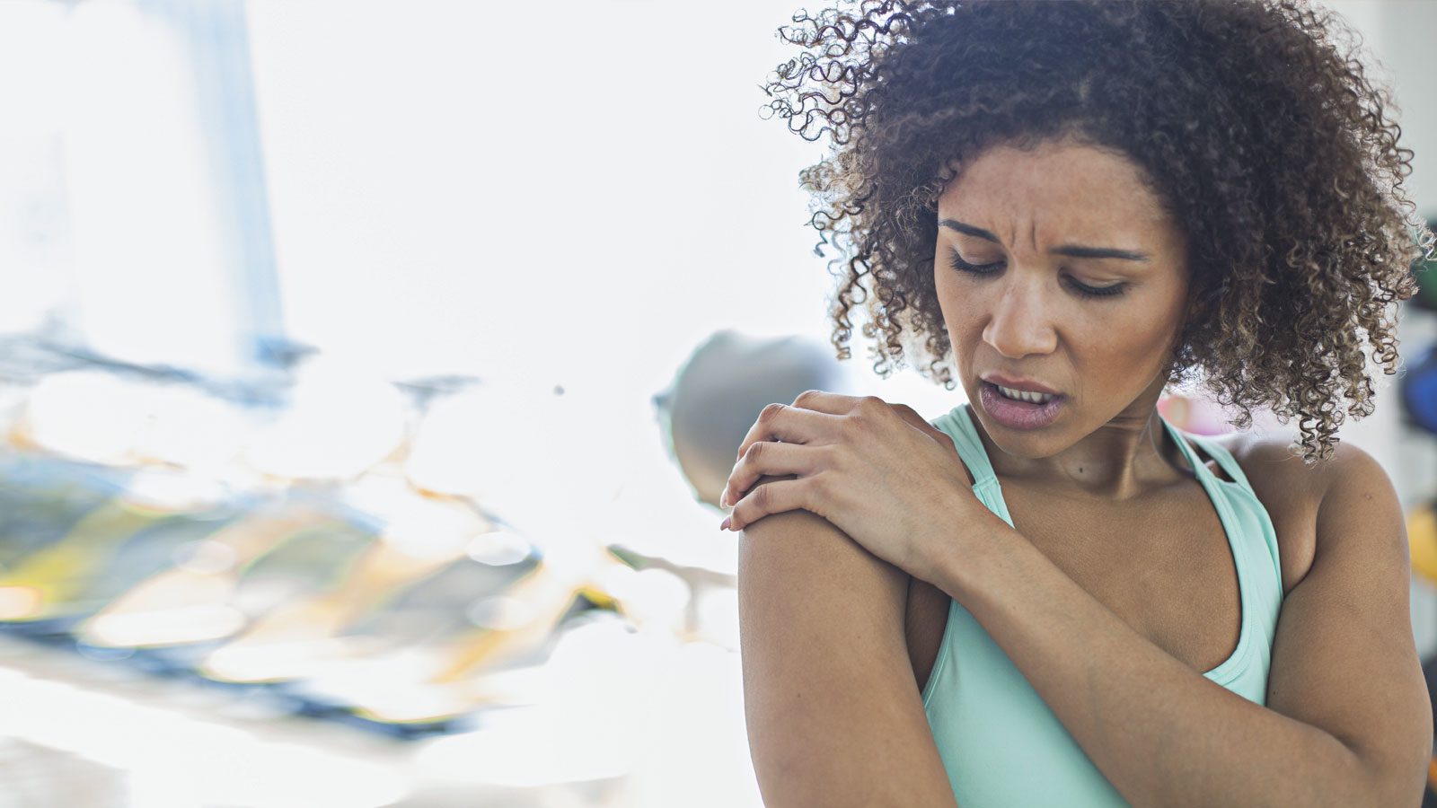 A woman holds her shoulder in pain.